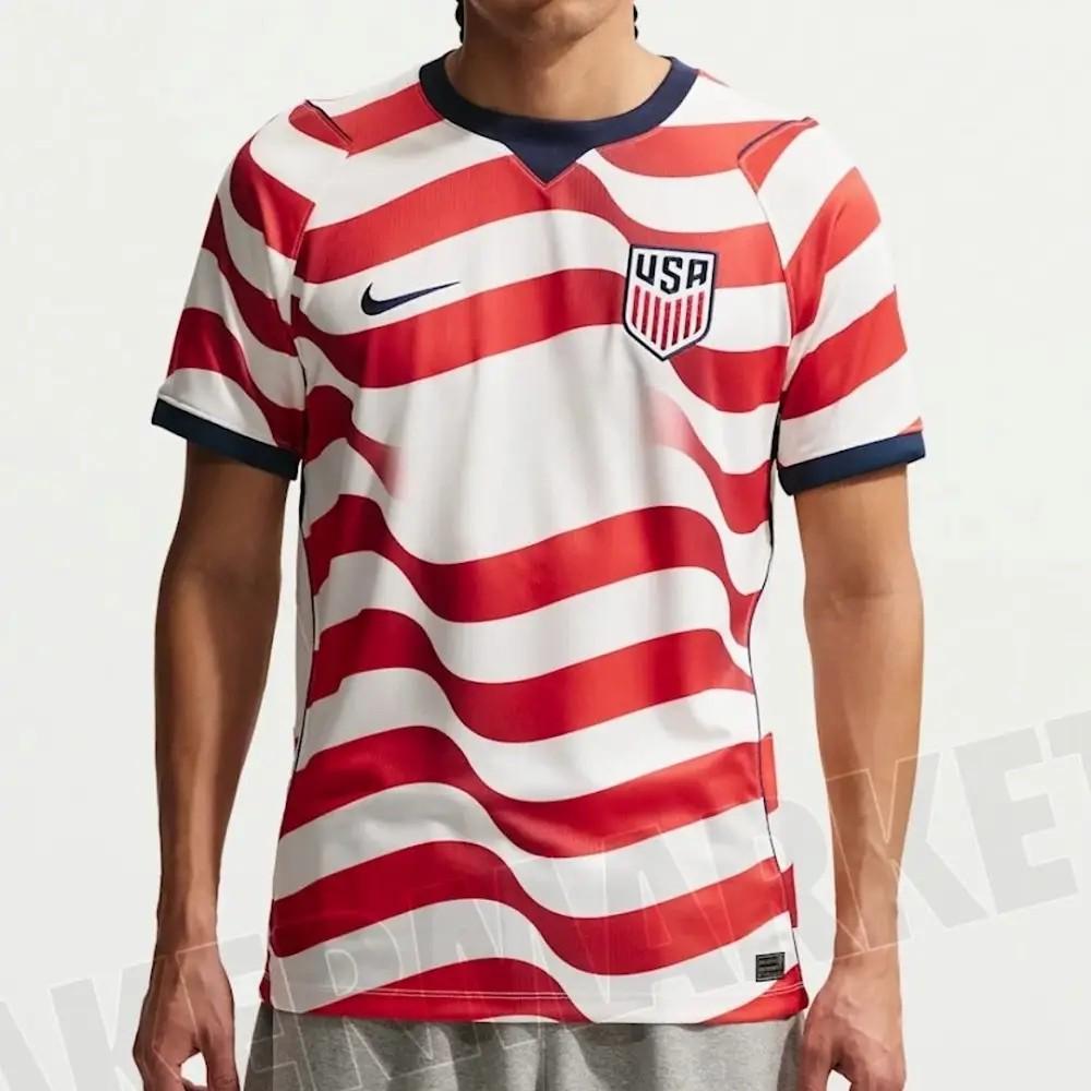 其中, 美国队主场球衣采用波浪条纹图案,颜色为深红色、米白色和海军蓝,灵感来自美国国旗和以往的美国球衣。